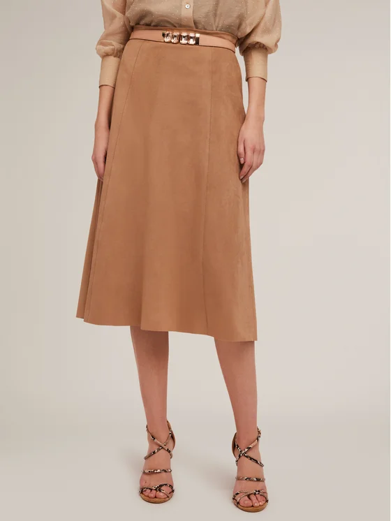 Gonna midi in tessuto spalmato effetto suède; tagli verticali e fondo svasato; chiusura con zip invisibile sul fianco