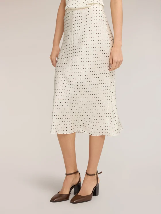 Gonna longuette in raso di viscosa tagliata in sbieco; stampa a pois; fascia elastica in vita; MADE IN ITALY.