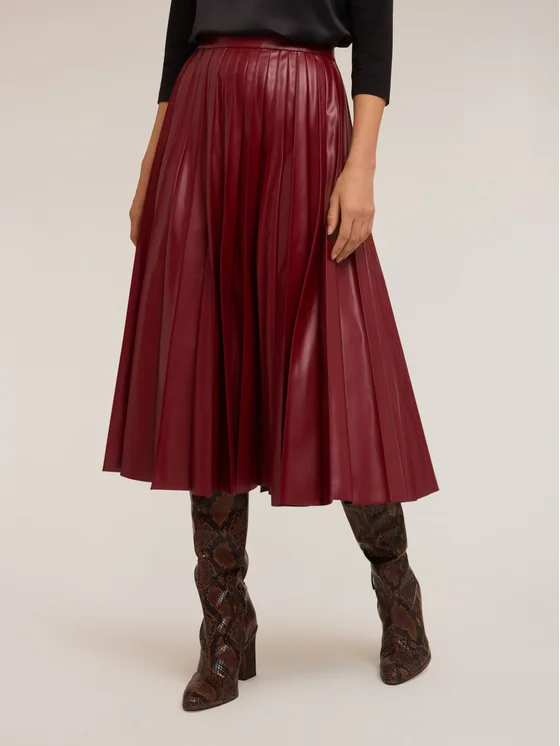 Gonna midi in tessuto spalmato; lavorazione a pieghe; chiusura laterale con bottone e zip