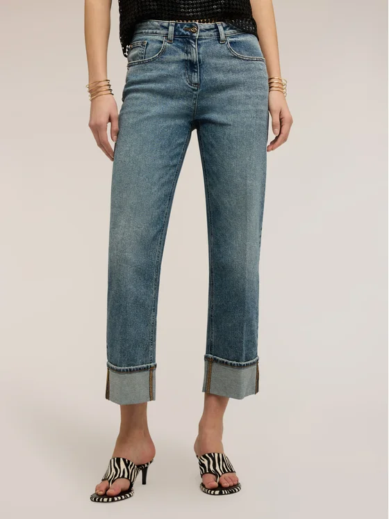 Jeans regular fit in denim con lavaggio medium blue; vestibilità wide con lunghezza media, chiusura con bottoni e zip; modello cinque tasche con orlo ripiegato e impunture a contrasto.