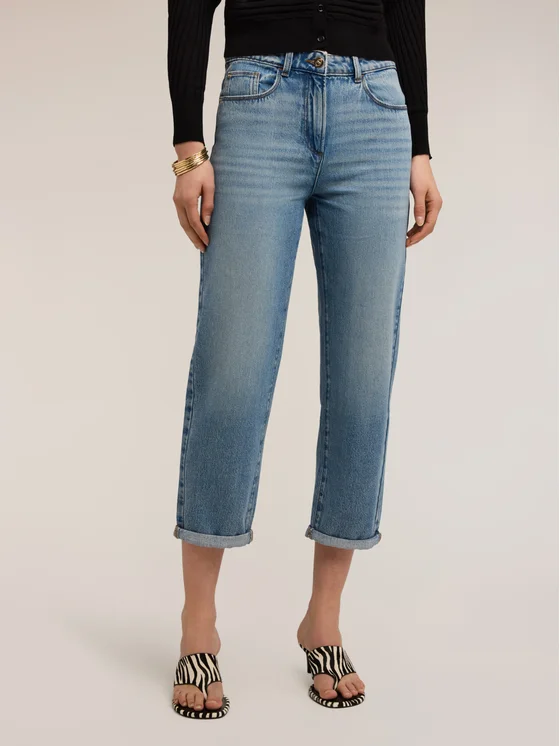 Jeans boyfriend in denim di cotone light blue wash; chiusura con bottone e zip; modello cinque tasche, orlo con risvolto.