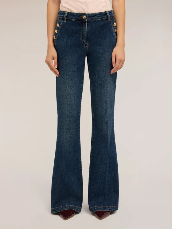 Jeans flare in denim di cotone dark blue wash; tasche all'americana davanti con bottoni decorativi in metallo; apertura frontale con bottone e zip, piega stirata nel centro gamba