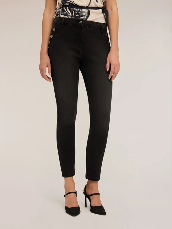 Jeans skinny in denim di cotone stretch; black wash; tasche laterali con motivo bottoni
