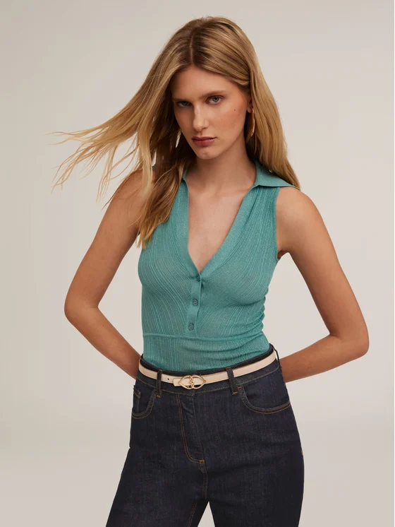 Top in jersey misto lurex; scollatura frontale con colletto a vela e bottoni a vista tono su tono; linea slim