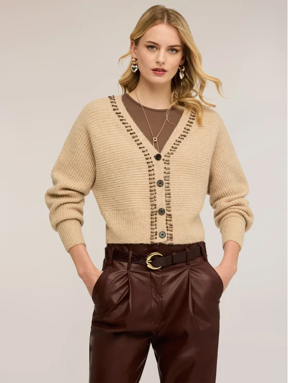 Cardigan in maglia pesante misto mohair; vestibilità kimono, lunghezza media, chiusura con bottoni frontali; scollatura a V, maniche lunghe, applicazioni di pietre tono su tono.