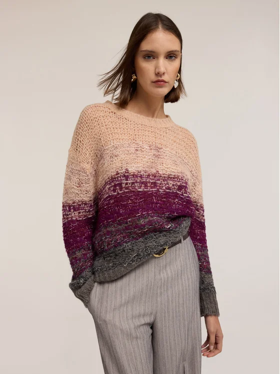 Maglia in filato misto mohair con lavorazione sfumata; vestibilità boxy con scollatura a girocollo; maniche lunghe.