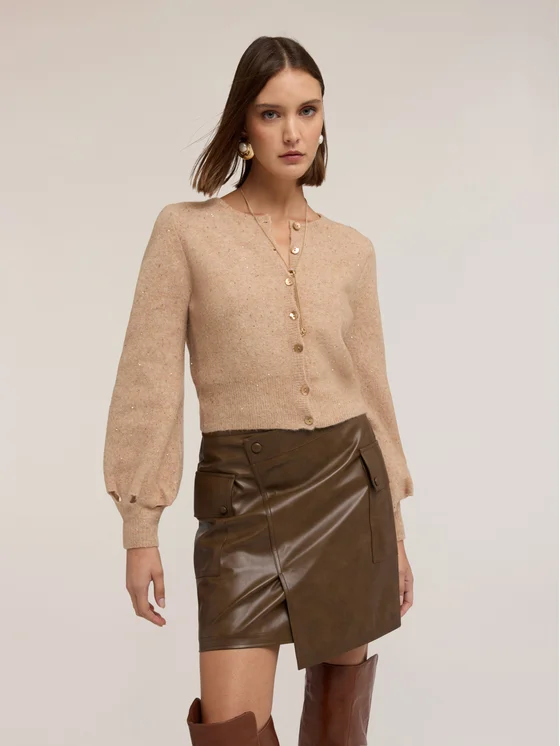 Cardigan in maglia misto mohair con lavorazione paillettes; vestibilità regular, scollatura girocollo con chiusura frontale a bottoni; maniche lunghe a palloncino con polsini a costine.