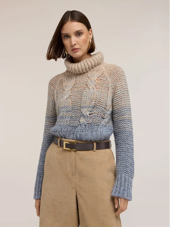 Maglia a trecce misto lana fantasia sfumata; collo alto a coste con risvolto; maniche lunghe con taglio raglan.