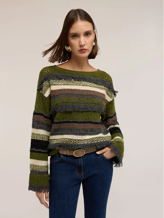 Maglia in misto lana con lavorazione ajouré fantasia a righe; vestibilità boxy con scollatura a barca; maniche lunghe.
