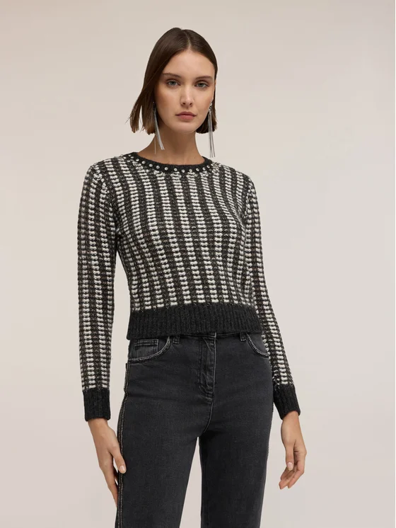 Maglia in tessuto lavorato; modello boxy con scollatura tonda e applicazione di pietre; maniche lunghe.
