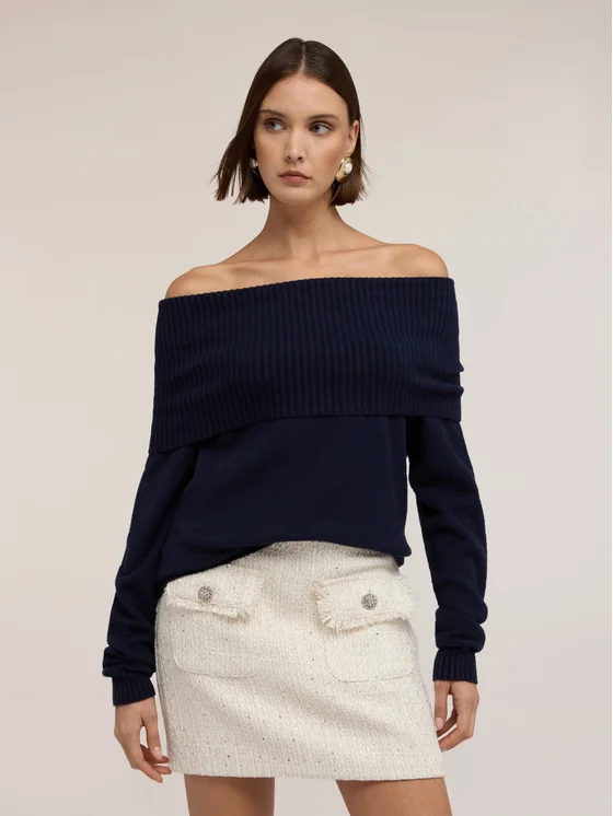 Maglia in filato misto viscosa; vestibilità regular con scollatura off-shoulder; maniche lunghe con polsini a coste; MADE IN ITALY.