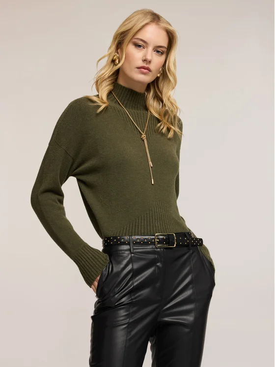 Maglia in filato misto viscosa; vestibilità regular con lunghezza media, scollatura dolcevita; maniche lunghe, lavorazione a coste sul collo e sul fondo; MADE IN ITALY.