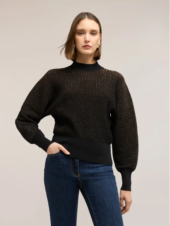 Maglia in filato misto viscosa con lavorazione lurex; scollatura a dolcevita frontale; maniche lunghe ampie con polsino sul fondo.