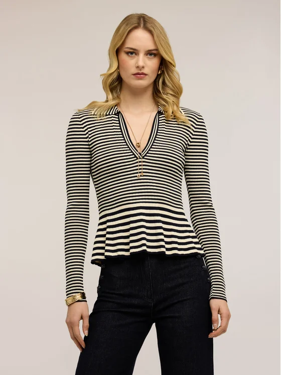 Maglia a righe in filato misto viscosa; modello sciancrato con balza sul fondo; scollatura a v con colletto, maniche lunghe.