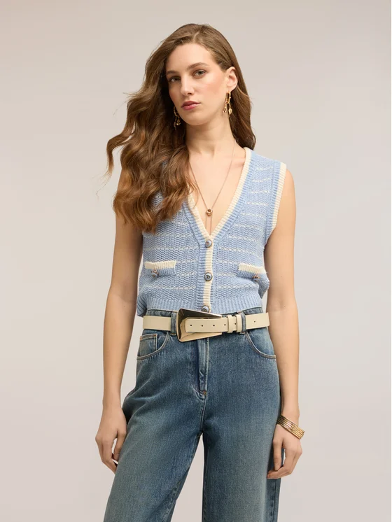 Gilet in filato misto viscosa a maglia fine lavorata con bordi a contrasto; chiusura frontale a v con bottoni a vista; tasche anteriori applicate con bottone.