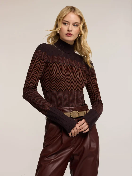 Maglia in filato misto viscosa; vestibilità fitted, collo alto dolcevita; maniche lunghe, lavorazione a coste con motivo chevron.; MADE IN ITALY.
