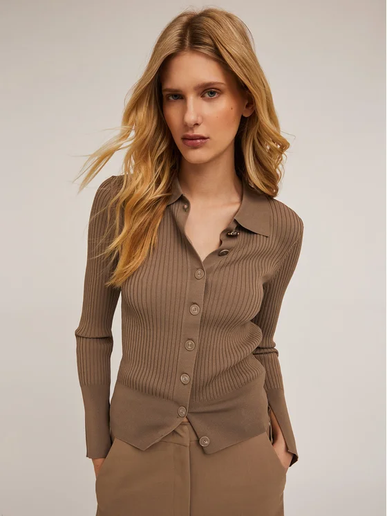 Cardigan in filato misto viscosa a coste; colletto a vela e bottoni a vista; maniche lunghe con polsino e spacco sul fondo, vestibilità slim