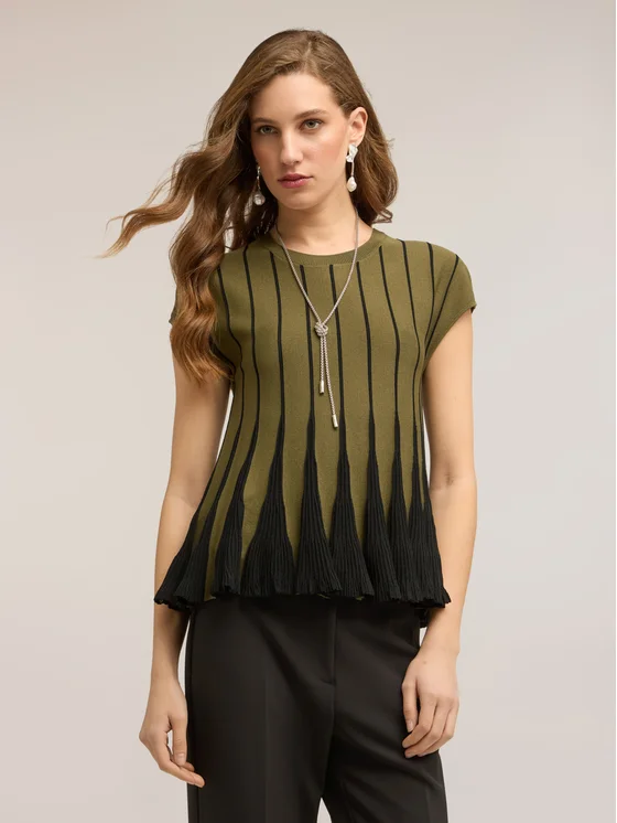 Maglia in filato misto viscosa; modello corto con vestibilità ad A, scollatura girocollo con bordo a coste; maniche corte ad aletta, lavorazione plissé sul fondo con righe verticali.
