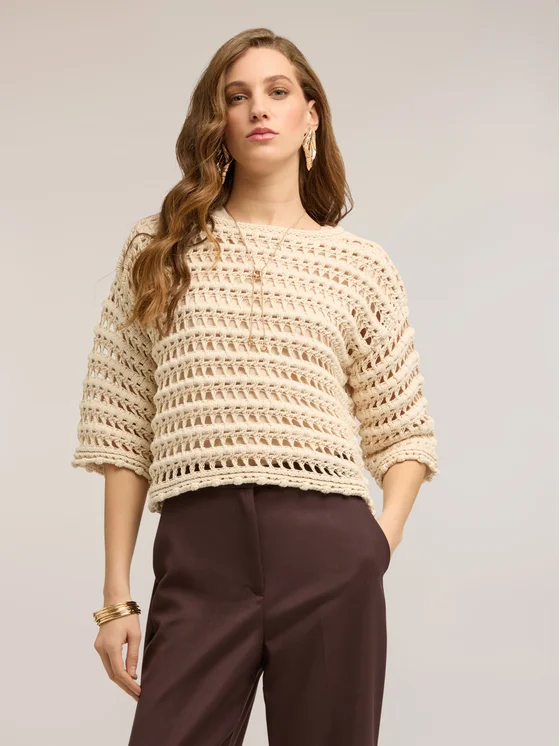 Maglia effetto crochet in filato misto viscosa; modello corto con vestibilità boxy; scollatura a barchetta, maniche tre quarti.