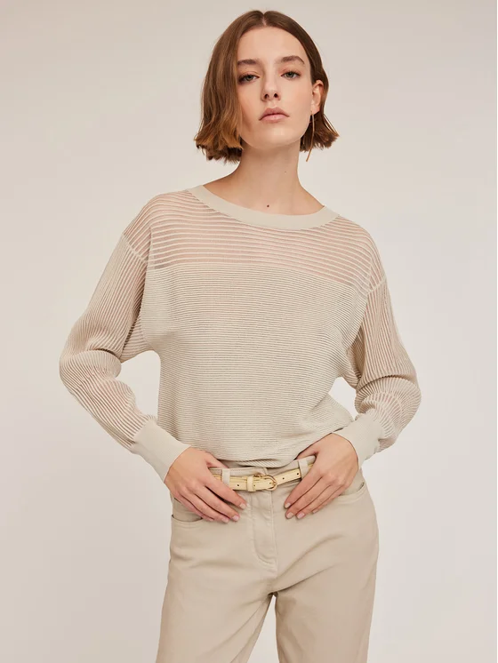 Maglia a coste in filato misto viscosa con motivo carré a righe trasparenti; scollatura a barca frontale; maniche lunghe taglio a kimono con polsino sul fondo
