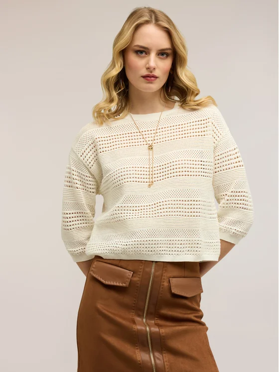 Maglia in filato misto viscosa con lavorazione traforata a righe orizzontali; modello corto con vestibilità over e girocollo; maniche a tre quarti.