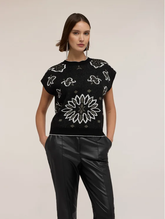 Top in maglia jacquard misto lana; modello senza maniche a spalla larga; scollatura tonda.