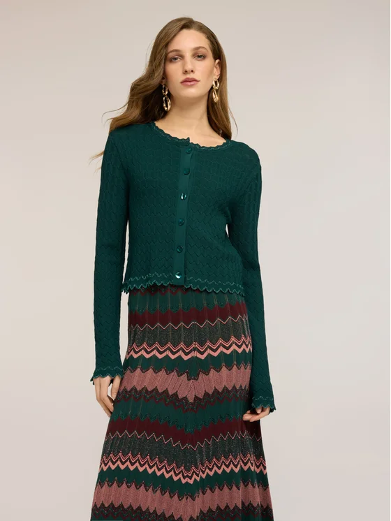 Cardigan corto in maglia misto viscosa lurex effetto pizzo; apertura frontale con scollatura tonda e bottoni a vista; maniche lunghe con bordi smerlati.