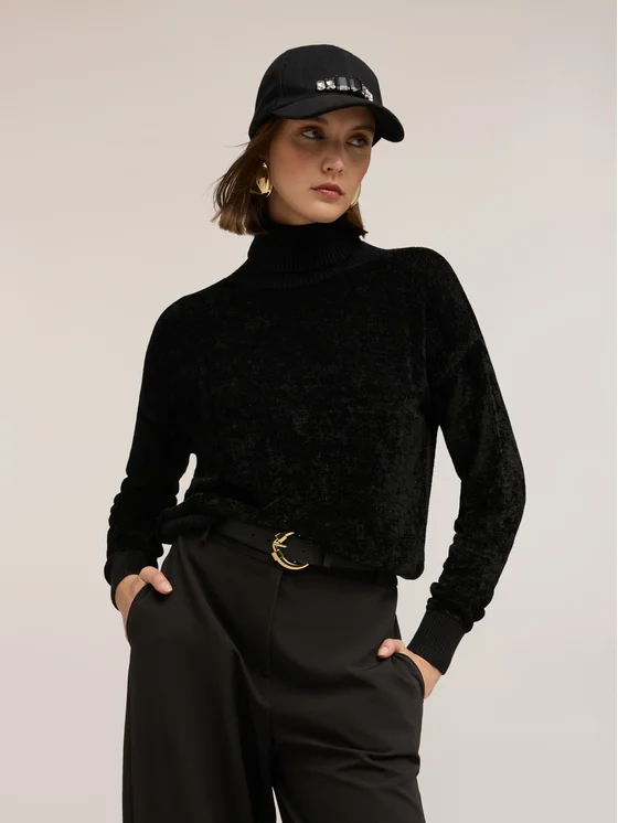 Maglia in ciniglia misto viscosa; vestibilità regular, lunghezza media; collo alto a dolcevita, maniche lunghe.