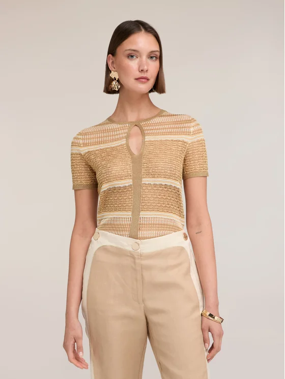 Maglia a righe in filato misto misto lurex; modello corto con girocollo e apertura centrale con keyhole; maniche corte.