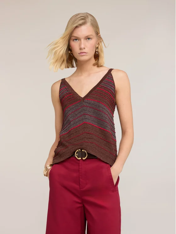 Top in maglia fantasia a righe in filato misto viscosa lurex; modello asimmetrico con vestibilità regular; scollatura a v frontale, spalline sottili.