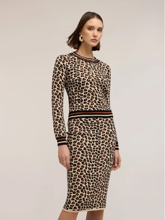 Maglia in filato misto viscosa fantasia leopardata; vestibilità fitted con scollatura girocollo e bordino a righe; maniche lunghe con polsini a coste; MADE IN ITALY.