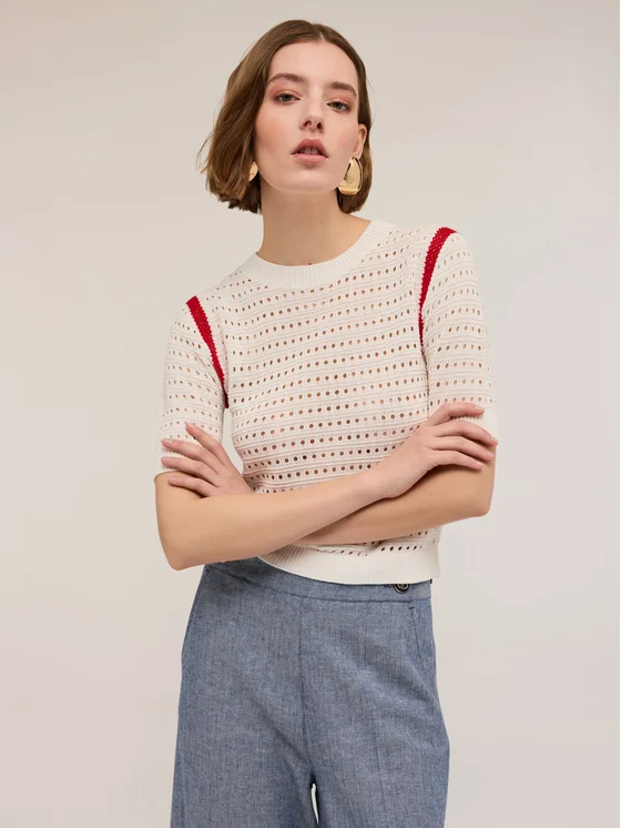 Maglia in filato misto viscosa effetto crochet; scollatura tonda frontale; maniche corte con bordi in contrasto colore