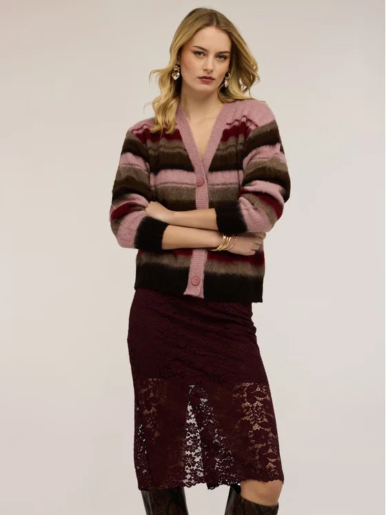 Cardigan in filato misto lana con fantasia a righe; scollatura a v con bottoni a vista; maniche lunghe; MADE IN ITALY.