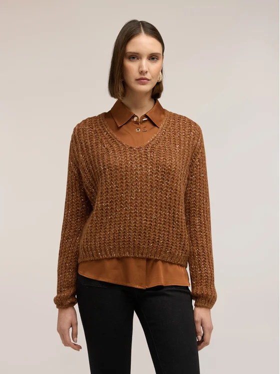 Maglia a trama larga con micro paillettes; vestibilità regular, lunghezza media; scollatura a V, maniche lunghe; MADE IN ITALY.