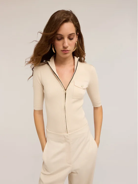 Cardigan a coste in filato di viscosa stretch; apertura frontale con zip e colletto alto; maniche corte slim con mostrine sulle spalle, tasca anteriore applicata