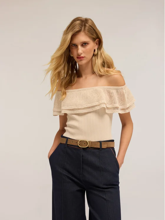 Top in maglia fine lavorata a trafori e a coste verticali; scollo off shoulders con balza orizzontale; senza maniche