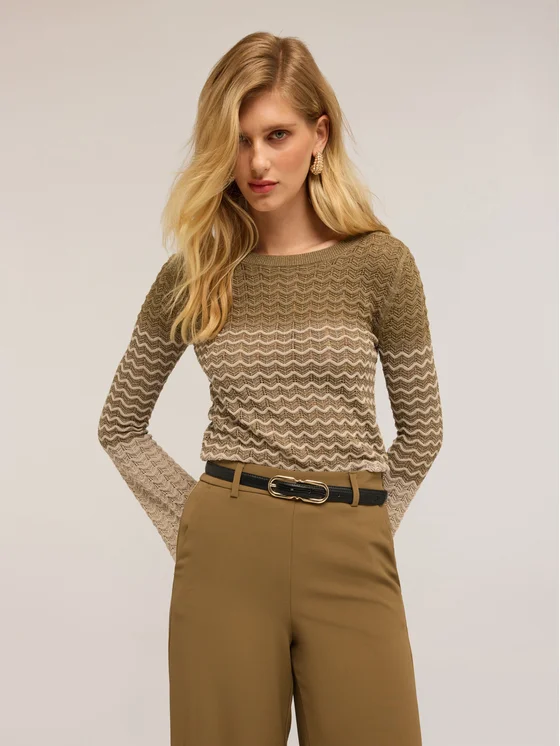 Maglia realizzata in filato lurex misto viscosa; lavorazione chevron con nuance degradé; maniche lunghe, scollatura tonda, bordi smerlati