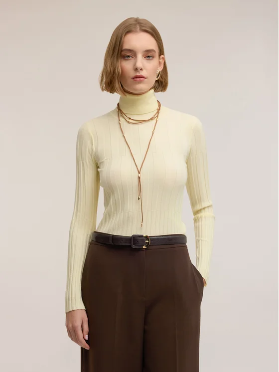 Maglia con lavorazione a coste asimmetriche; vestibilità slim, collo alto a dolcevita; maniche lunghe.