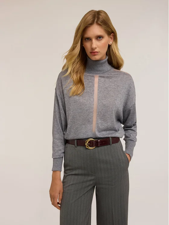 Maglia dolcevita in filato misto lana con inserto trasparente; collo alto con risvolto; maniche lunghe con taglio spalla sceso