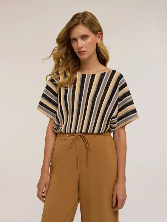 Maglia in filato misto viscosa lurex fantasia a righe; scollatura ampia a barca; maniche corte con taglio a kimono