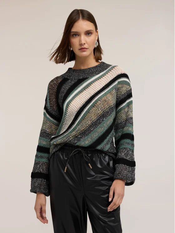 Maglia in filato misto mohair con lavorazione ajouré; vestibilità over, scollatura girocollo; maniche lunghe con taglio spalla sceso.