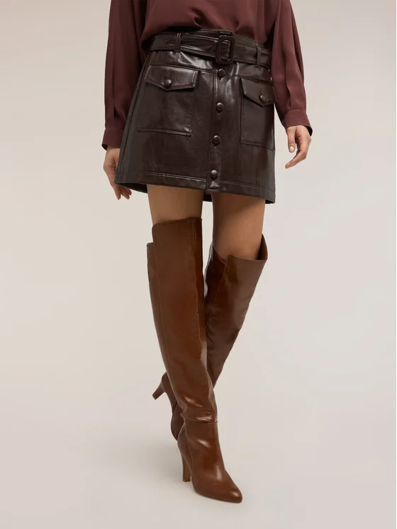 Minigonna in tessuto spalmato; modello corto con cintura in vita e chiusura con bottoni frontali; due tasche applicate sul davanti con patta e bottone.
