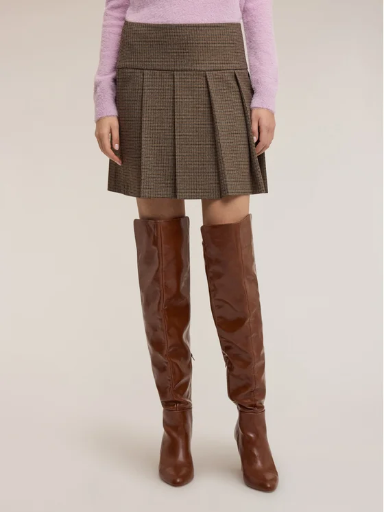 Gonna corta a pieghe in tessuto tinto filo di poliviscosa; fantasia check; baschina alta con chiusura a zip; MADE IN ITALY.