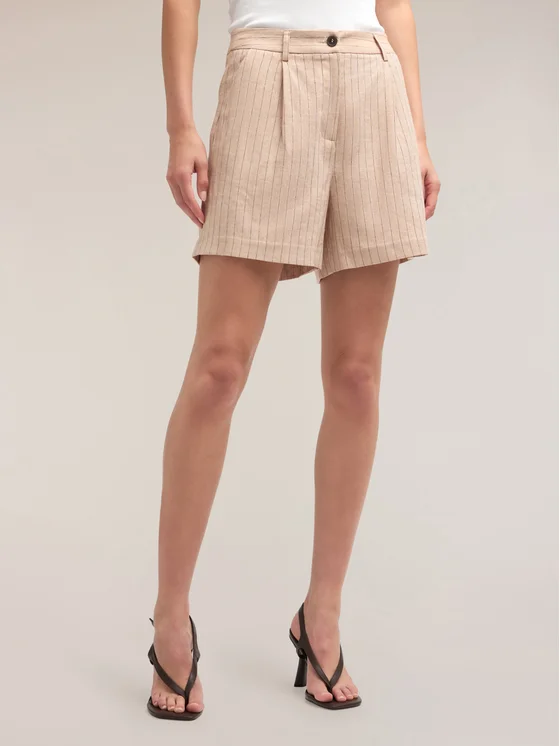 Shorts in tessuto spigato fantasia gessata misto lino; apertura frontale con bottone e zip, pieghe nella parte superiore; tasche all'americana inserite nel fianco