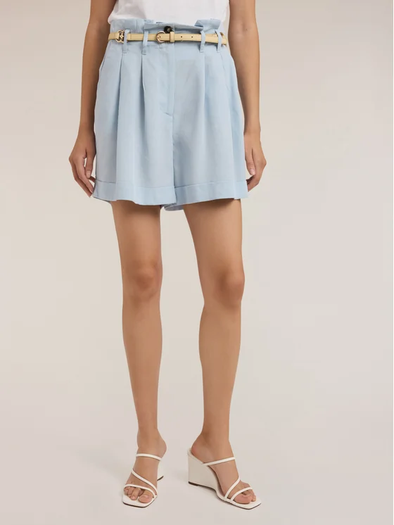 Shorts con pieghe in tessuto fluido in lino misto lyocell; vita alta con apertura con zip; gamba larga con risvolto sul fondo