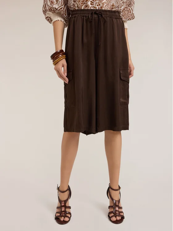 Bermuda in raso lucido tinta unita; vita stretch con coulisse, tasche all'americana inserite nel fianco; tasche cargo laterali con patta, fondo largo