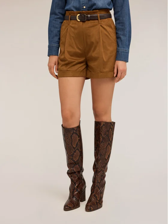 Shorts in tessuto effetto velluto; apertura frontale con bottone e zip; tasche all'americana inserite nel fianco, risvolto sul fondo