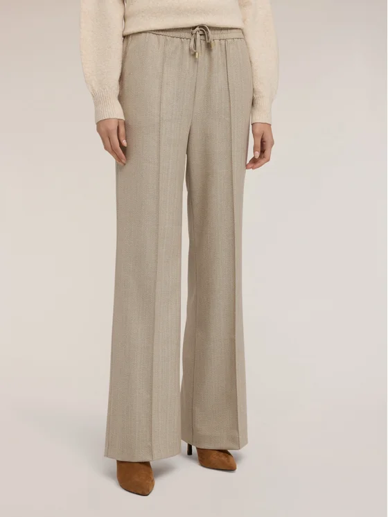 Pantalone palazzo in flanella di poliviscosa; vestibilità straight, chiusura con coulisse in vita; tasche laterali inserite nei fianchi.