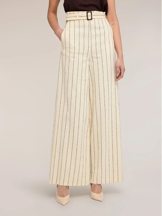Pantaloni palazzo in tessuto tinto filo misto cotone gessato; vestibilità regular, vita alta con cintura in vita; tasche laterali inserite nei fianchi.