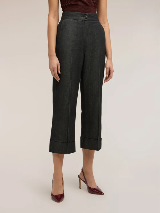 Pantaloni cropped in tessuto crêpe di poliviscosa misto ramiè; chiusura frontale con bottone e zip; tasche all'americana, piega stirata nel centro gamba, fondo con risvolto.